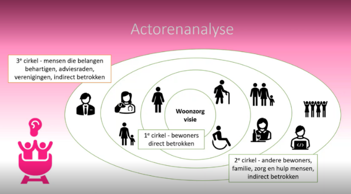 Verhijde en Van der Heijden raden een actorenanalyse aan om vooraf inzichtelijk te maken wie je kunt betrekken bij de woonzorgvisie. In deze analyse verdeel je de verschillende groepen betrokkenen in verschillende ringen in.