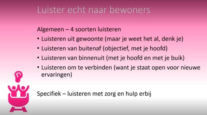 In gesprek met direct en indirect betrokkenen is het belangrijk om goed te luisteren, want dan haal je informatie op waar je echt mee verder kan. Van der Heijden: “We zijn gewend om op een bepaalde manier te luisteren. Zo luister je beleidsmatig vooral met je hoofd. Stel je eens de vraag of je de verhalen van de mensen die je spreekt echt hoort en of je echt open staat voor de betekenis ervan?” Volgens Van der Heijden kan je op verschillende manieren naar een verhaal luisteren. “Wees je daarvan bewust. Soms luister je vanuit je eigen vooroordelen en hoor je niets nieuws, of dat denk je althans. Een andere keer word je emotioneel geraakt door wat je hoort en luister je anders omdat het wat met je doet. Mooi is het als je verbindend luistert en open staat voor nieuwe ervaringen. Die leveren je nieuwe verbindingen en oplossingen.”