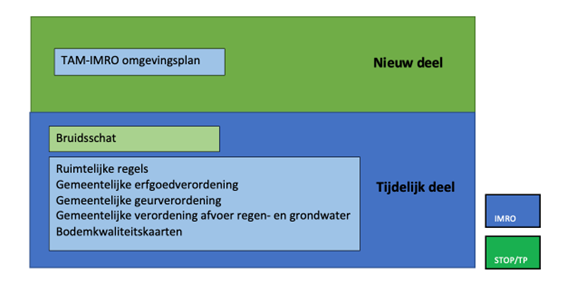 De TAM-IMRO is specifiek om het omgevingsplan digitaal te kunnen publiceren. In het onderstaand schema is dat uitgelegd. TAM-IMRO is dus bedoeld om ‘de winkel open te houden’ zolang je nog niet over bent op STOP/TPOD als gemeente. Het is niet bedoeld om een nieuw omgevingsplan op te bouwen.