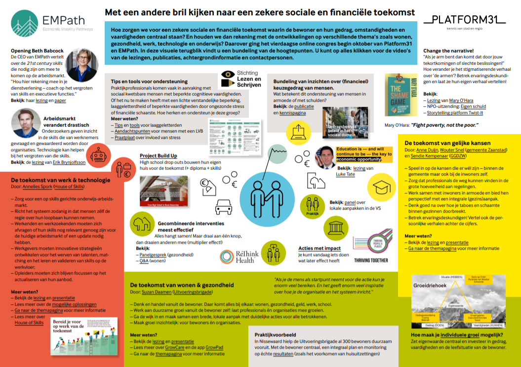 Hoe zorgen we voor een zekere sociale en financiële toekomst waarin de bewoner en hun gedrag, omstandigheden en vaardigheden centraal staan? En houden we dan rekening met de ontwikkelingen op verschillende thema’s zoals wonen, gezondheid, werk, technologie en onderwijs? Deze visuele terugblik bundelt de hoogtepunten van een vierdaags online congres: met video's van de lezingen, publicaties, achtergrondinformatie en contactpersonen.