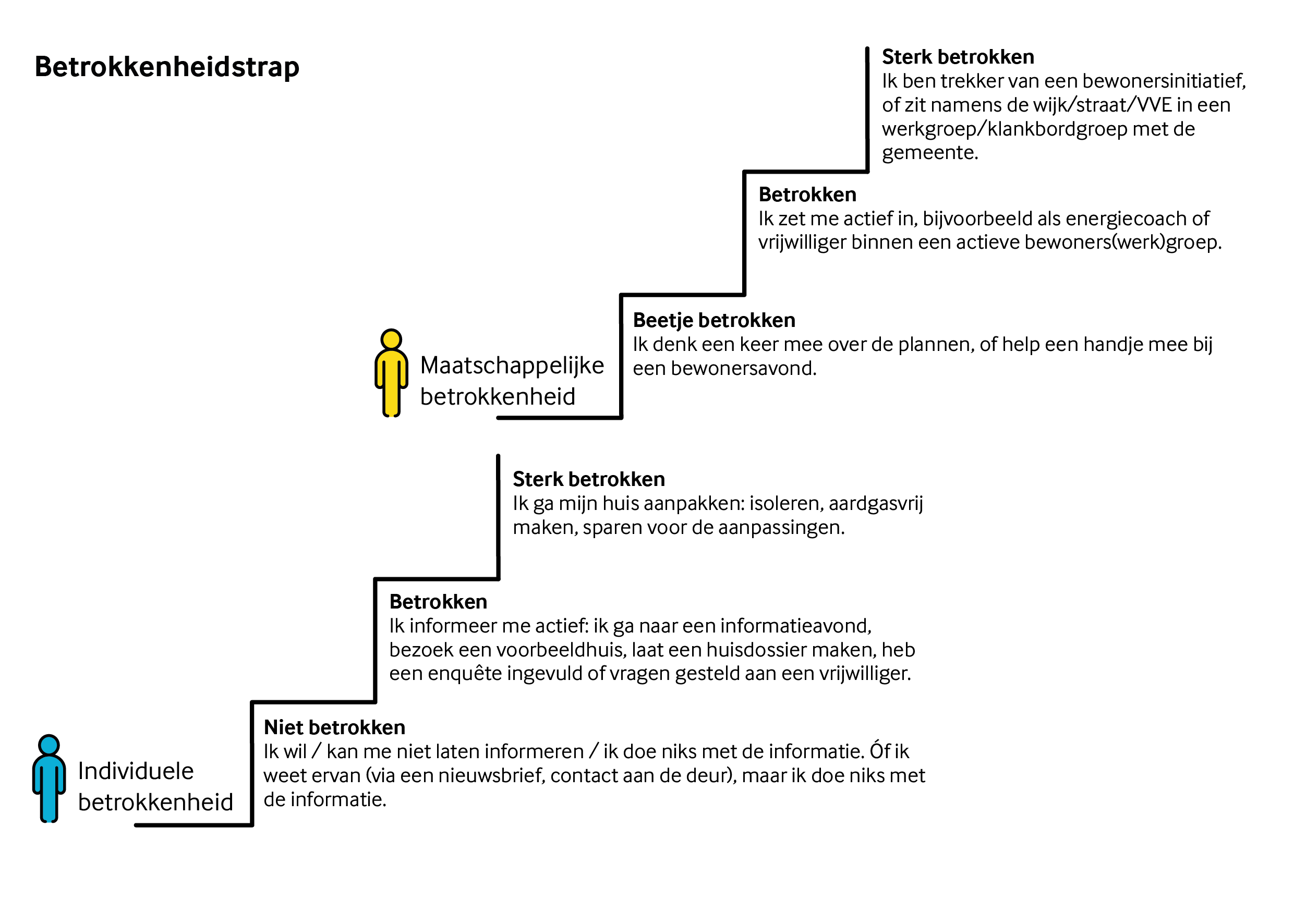 Om de betrokkenheid van wijkbewoners goed in beeld te krijgen is het nodig om van perspectief te veranderen: van het (gemeentelijk) initiatiefnemersperspectief met de participatieladder naar het bewonersperspectief met: de betrokkenheidstrap.