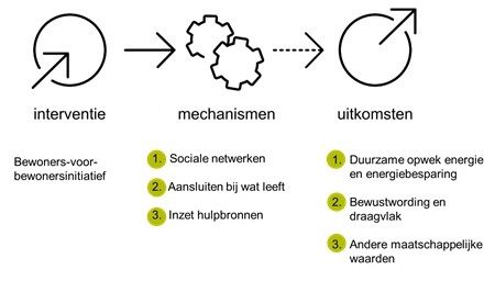 Om te kunnen achterhalen waarom BvB-initiatieven succesvol zijn en welke effecten zij bereiken, is een lichte variant van de wetenschappelijke Realist Review-methode gebruikt. Hierbij wordt in de literatuur en met experts een verklaring gezocht voor waarom een interventie leidt tot bepaalde uitkomsten, door te onderzoeken welke mechanismen hiervoor zorgen. In de Realist Review-methode wordt een programmatheorie opgesteld, die aangeeft welke relaties je verwacht tussen de interventie, de verklarende mechanismen en de uitkomsten. Vervolgens wordt in de literatuur en gesprekken met experts ‘bewijsmateriaal’ gezocht voor relaties tussen mechanismen en uitkomsten. Figuur 1 toont op basis van de eerder besproken resultaten uit literatuur en gesprekken met experts en initiatiefnemers de opgestelde programmatheorie. Om verbanden aan te tonen tussen individuele mechanismen en uitkomsten, is meer onderzoek nodig dat zich diepgravend genoeg op individuele relaties richt. Figuur 1 geeft wel aan hoe de interventie (het BvB-bewonersinitiatief) via een groep mechanismen tot uitkomsten leidt.